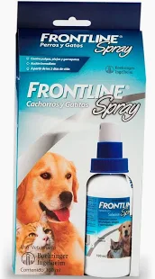 Frontline Spray es un antiparasitario externo de acción rápida a base de fipronil para perros y gatos, eficaz contra pulgas, garrapatas y piojos. Seguro desde los 2 días de vida y en hembras gestantes/lactantes, se aplica a contrapelo hasta humedecer la piel, ofreciendo protección hasta por 30-60 días.